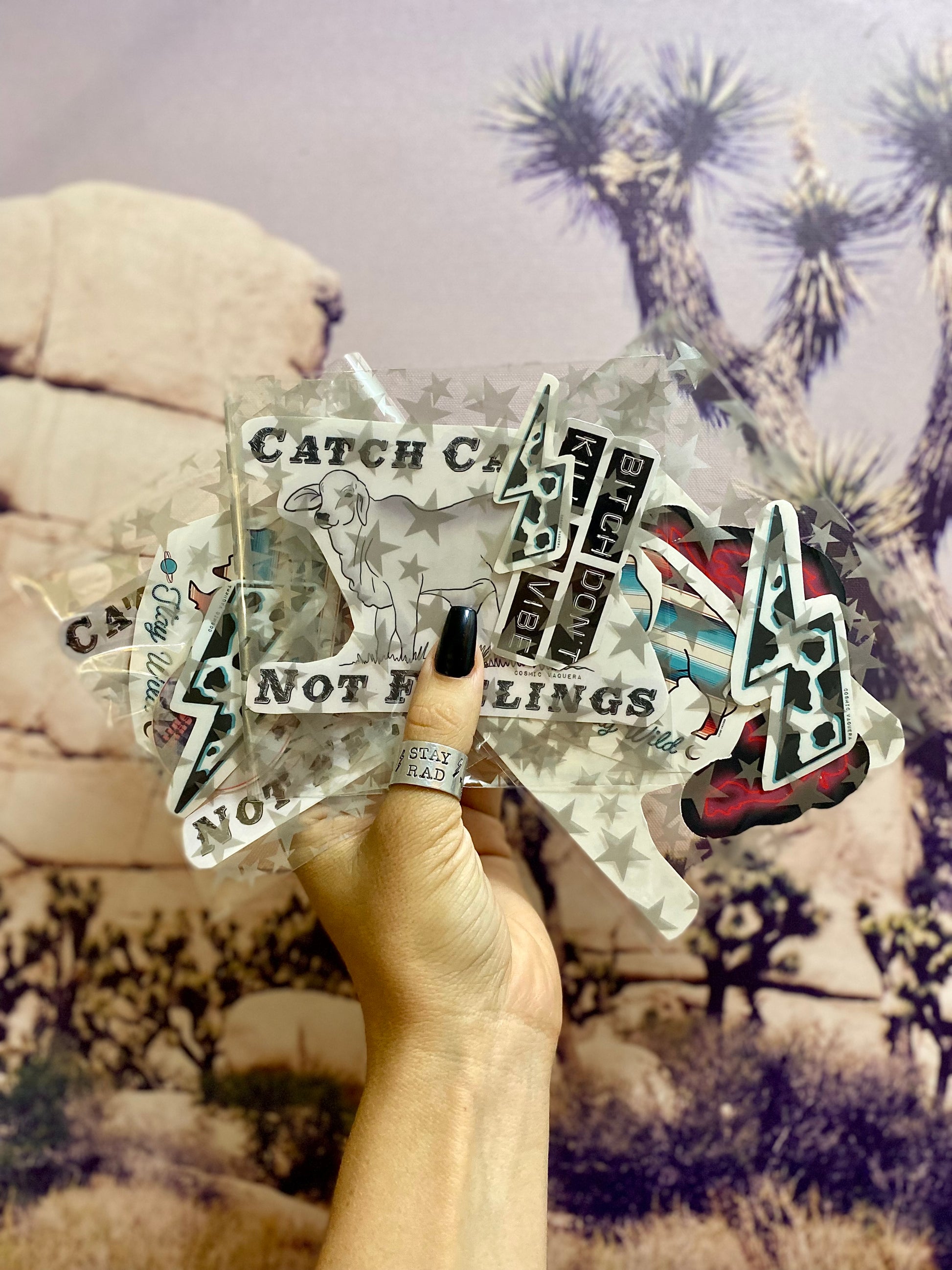 Seconds Sticker packs in a lucky dip. Packs can include Holographic, large, medium and small stickers! They are all odd and wonderful but they are only indoor use! Most are not waterproof!