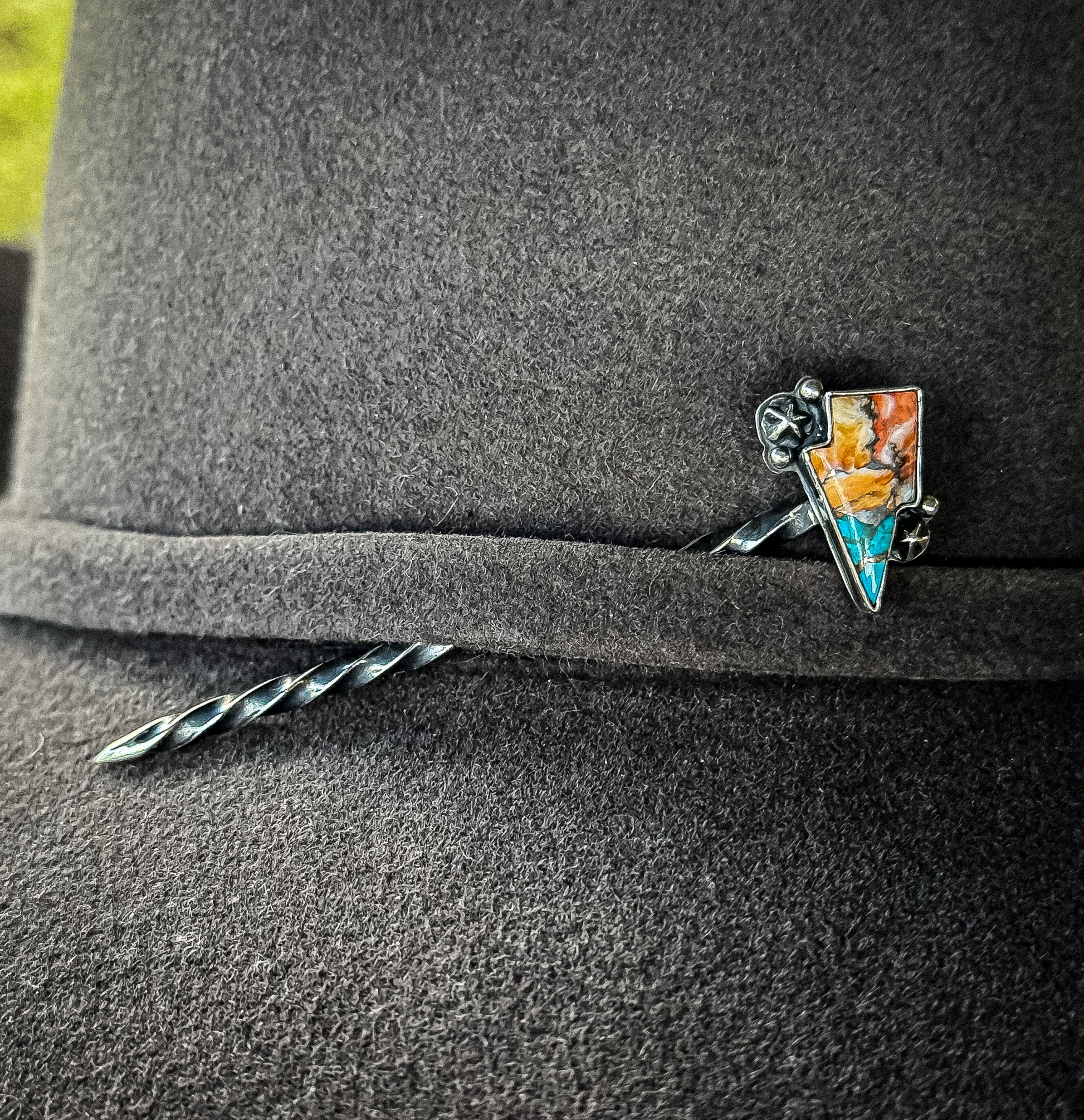 Spiny oyster turquoise bolt wrapped in .925 sterling silver with a sterling silver twisted toothpick. Perfect for any cowgirl hat