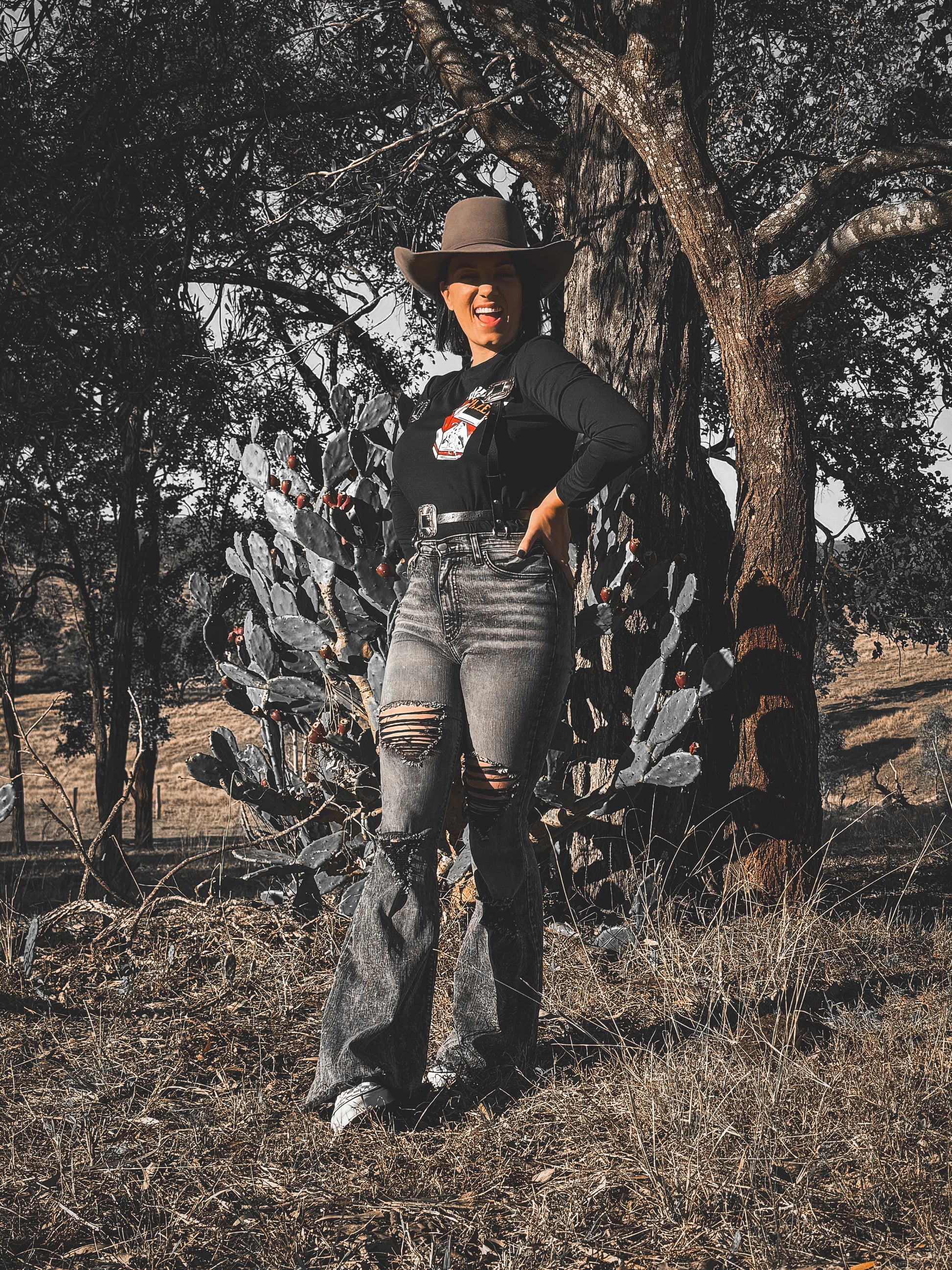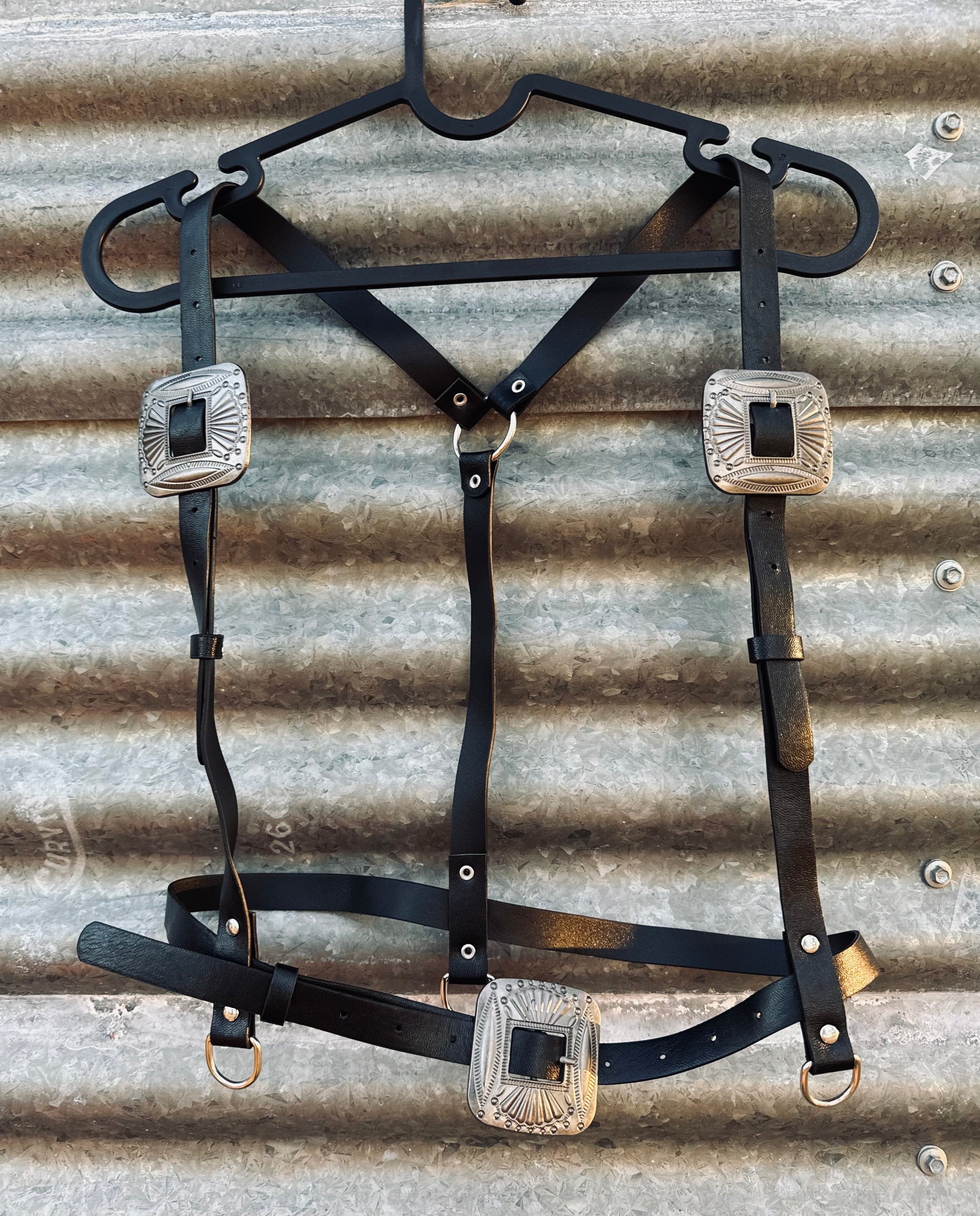 This western style harness is an accessory to accompany all y'allternative looks. Adjustable, to be buckled to fit you best.