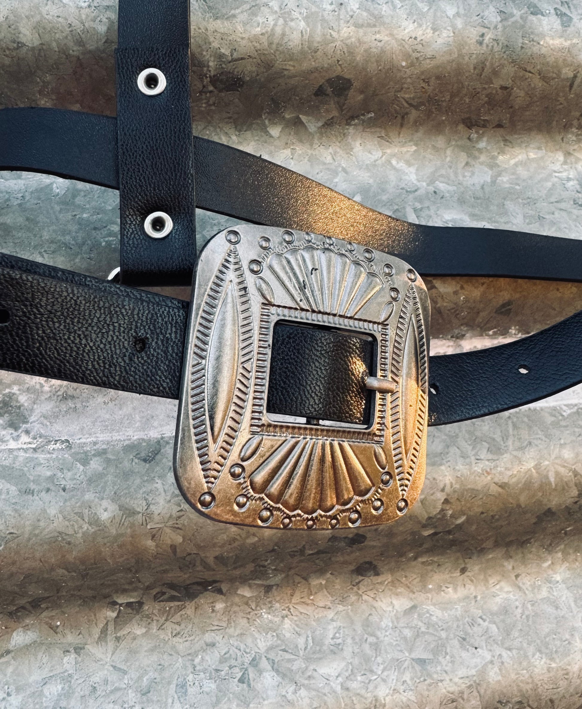 Ft. western conch buckles, & dreary black vegan leather.