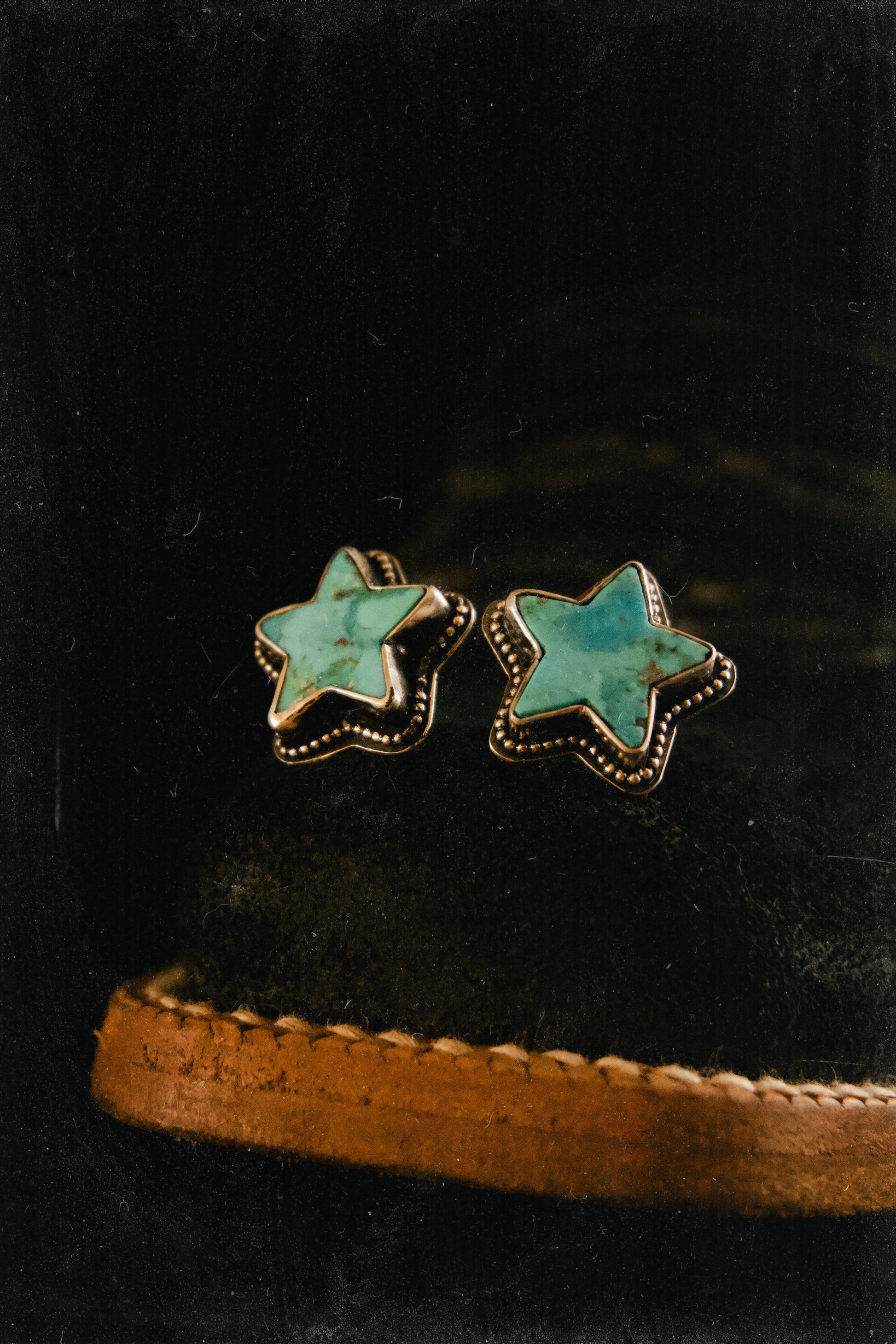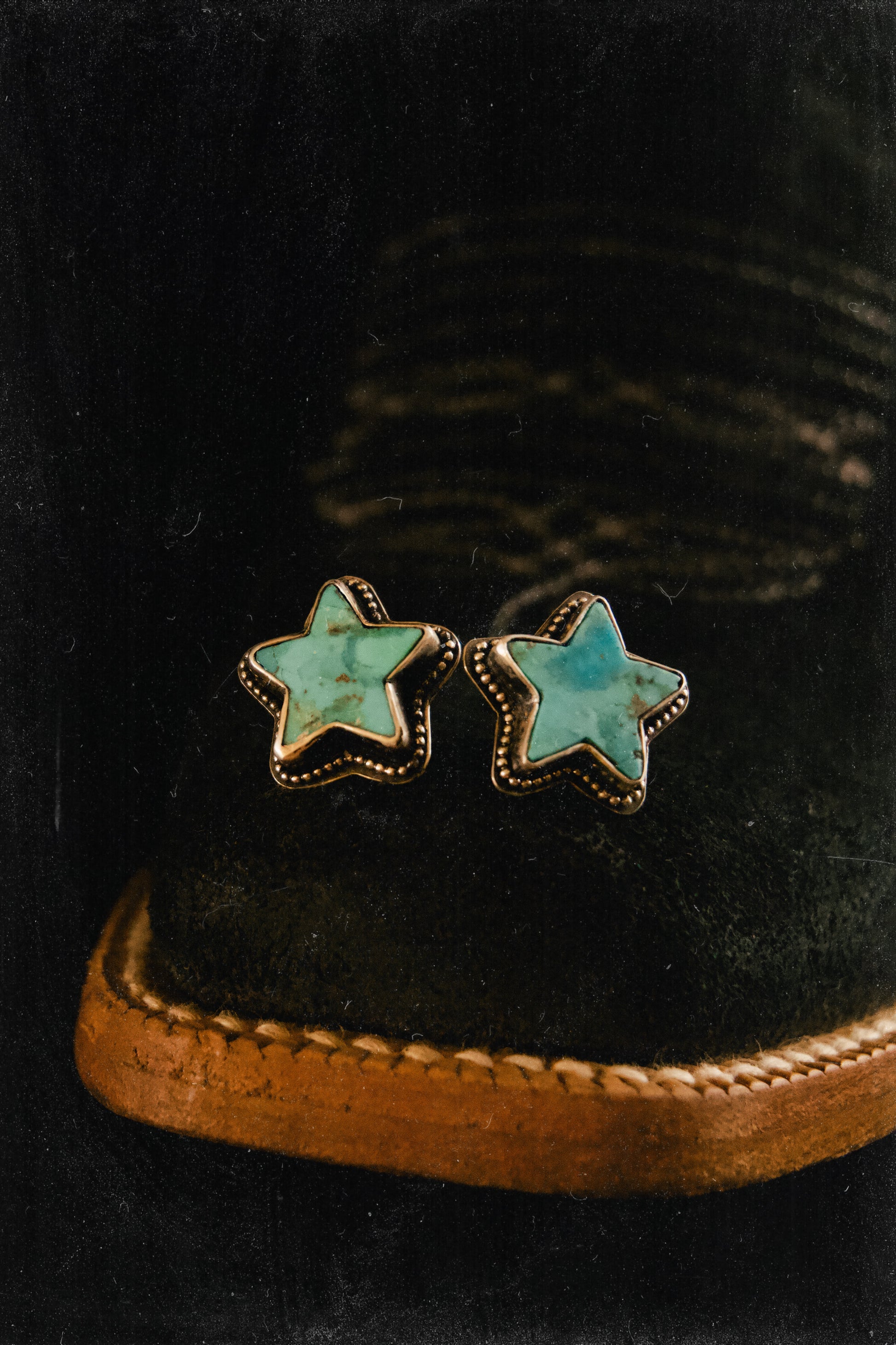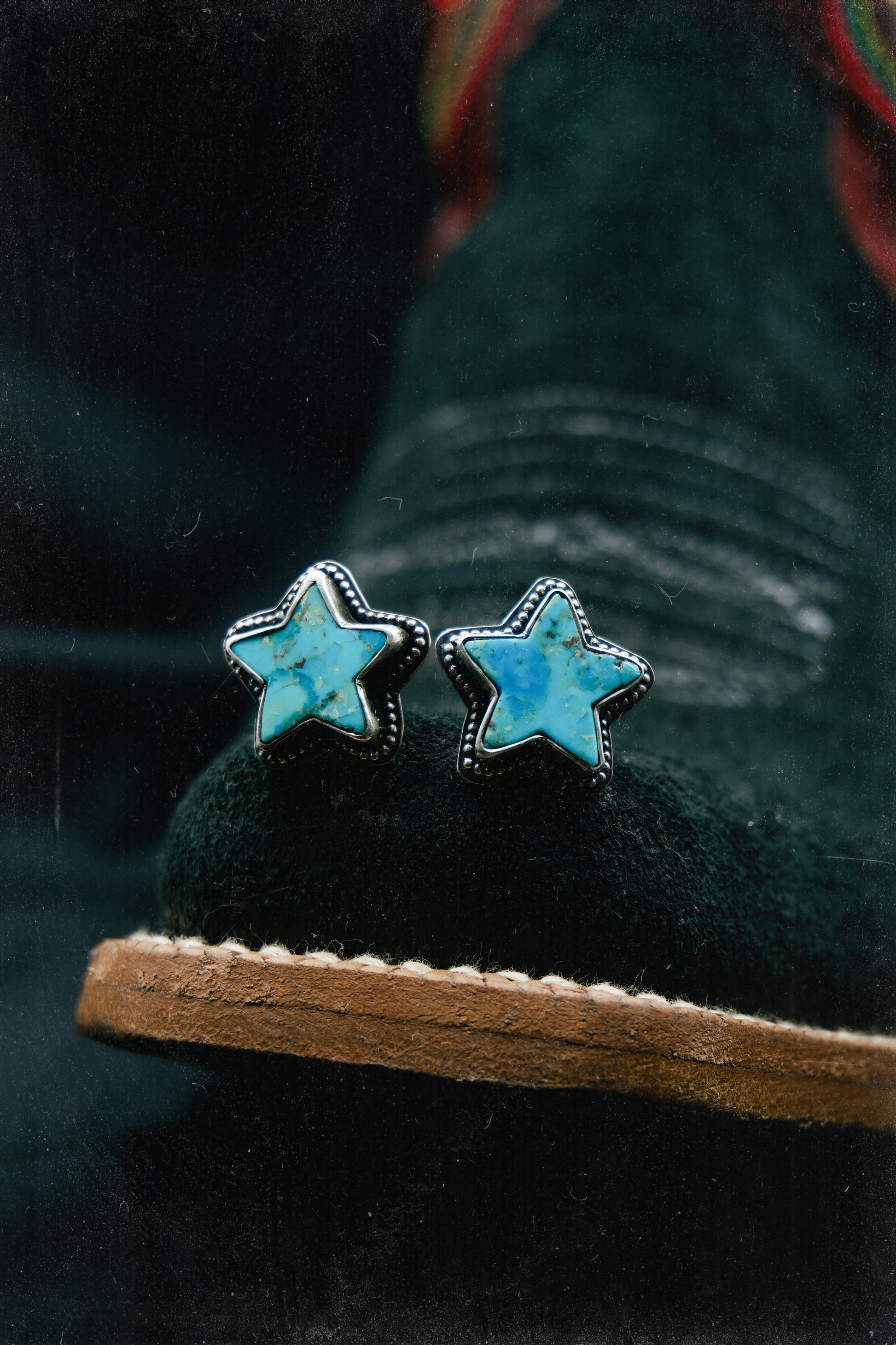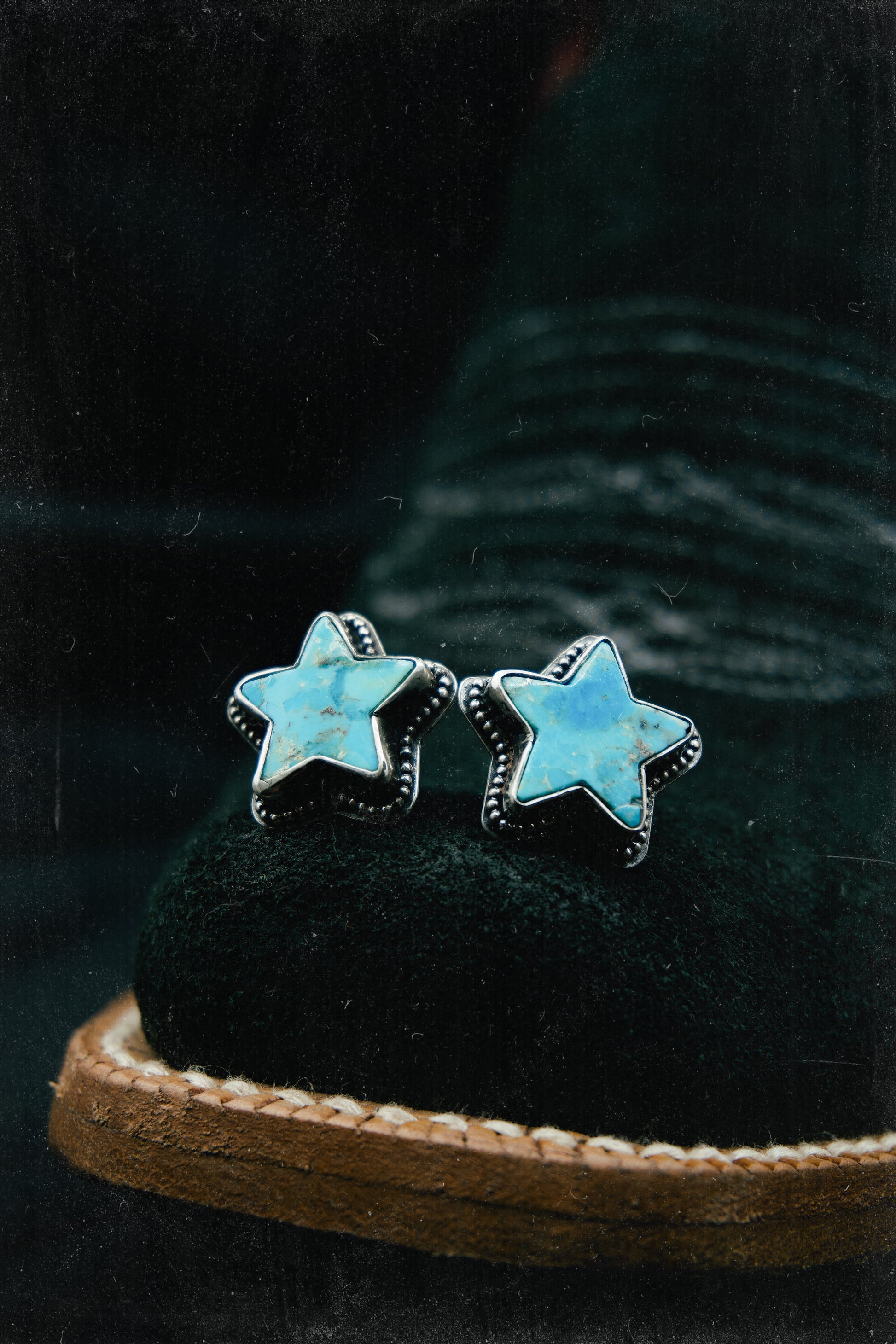 These handcrafted stud earrings feature star-shaped Kingman Mohave turquoise set in sterling silver with a sculpted beaded border. Thoughtfully sized for daily wear, they offer a clean western touch without overwhelming your look. Each stone is unique, allowing every pair to hold its own character and colour variation. Matching Necklace available.