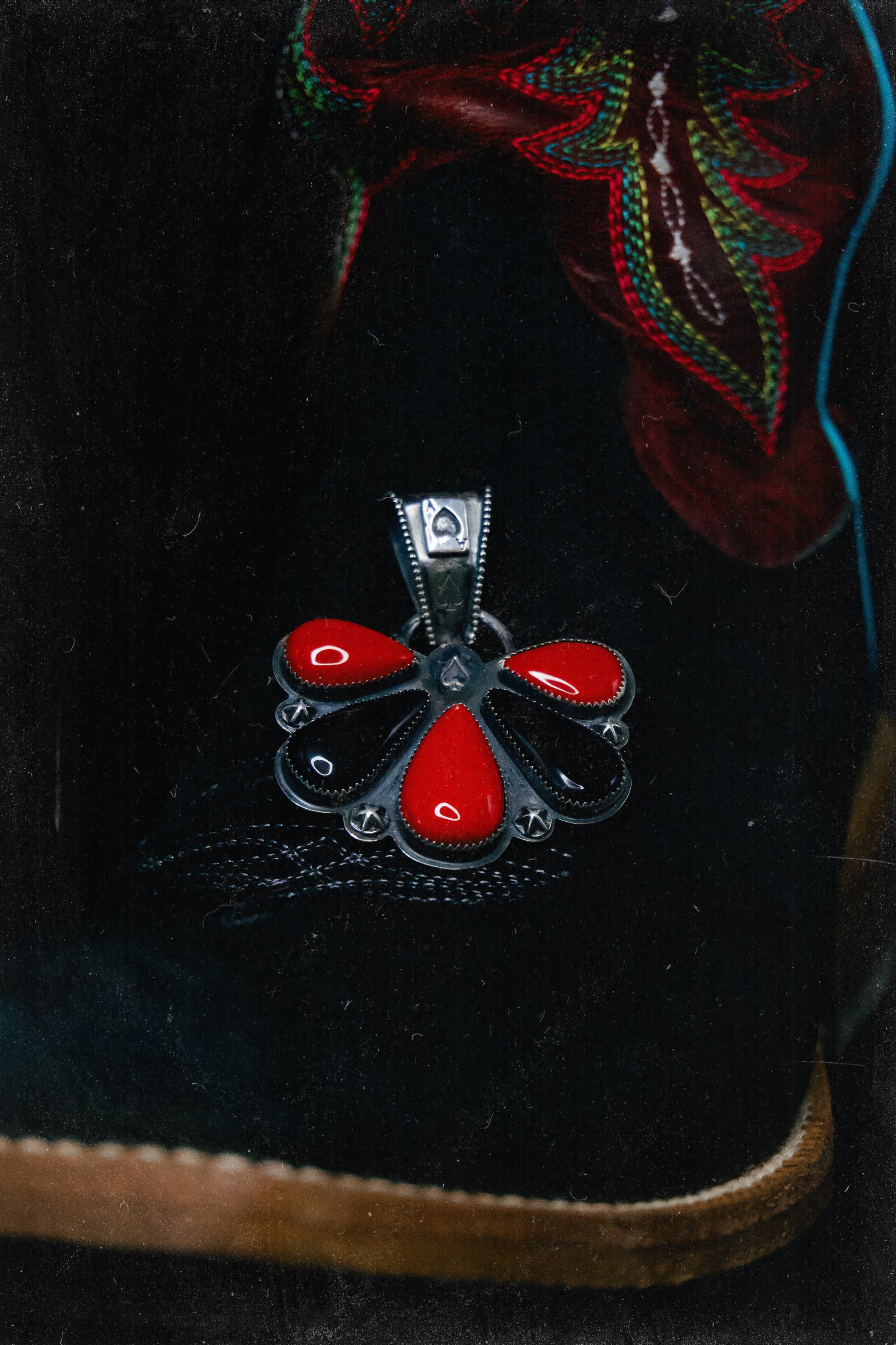 This pendant was the first design concept behind the Y’ALLT Collection and remains its defining piece. Handcrafted in sterling silver, it features four teardrop stones, two red Rosarita and two black Onyx, arranged in a symmetrical form.